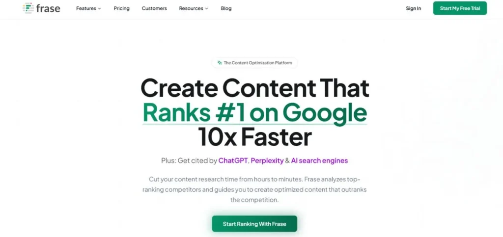 Frase puts a very clear emphasis on aiding writers in generating content that is easy to interpret and cite by the generative engines. Instead of focusing on post-publication monitoring, the platform focuses on pre-publication optimisation – making sure that each article is designed properly and at the beginning.