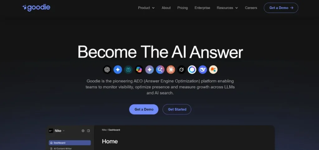 Goodie is offered as a comprehensive solution to those organisations that are serious about getting AI-driven visibility mastered. The platform tracks brand mentions, citations and sentiment in the entire generative engine range that includes ChatGPT, Gemini, Claude, and Perplexity.