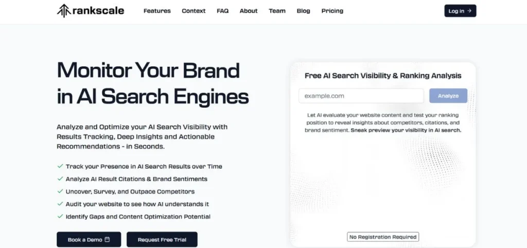Rankscale is an entry point to professional GEO monitoring, providing the essentials at very affordable prices. The platform offers the brand dashboards that monitor the visibility ratings and the average ranking of the engines, such as ChatGPT, Claude, and Google AI Overviews.