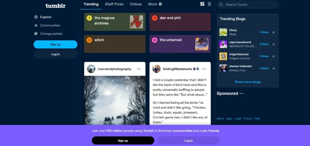 Tumblr focuses on visual-based microblogging (images, GIFs, short videos). The feed on the platform favours eye-catching images and is brief in text. Tumblr can be used effectively by content marketers of visual industries such as art, photography, and fashion to target younger audiences with creative interests.